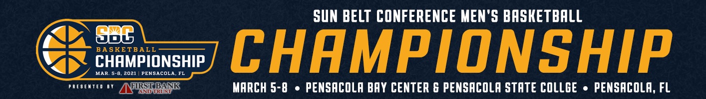 Championship Schedule Friday, March 5 G1: Hartsell Arena at Pensacola State College • 5 p.m. CT #4W Arkansas State 62 #5E Georgia Southern 58 Box Score | Recap | ESPN+ G2: Pensacola Bay Center • 5:30 p.m. CT #3E South Alabama 80 #6W ULM 72 Box Score | Recap | ESPN+ G3: Pensacola Bay Center • 8 p.m. CT #3W UTA86 #6E Troy91 Box Score | Recap | ESPN+ G4: Hartsell Arena at Pensacola State College • 7:30 p.m. CT #4E App State 67 #5W Little Rock 60 Box Score | Recap | ESPN+ Saturday, March 6 G5: Pensacola Bay Center • 5:30 p.m. CT #4W Arkansas State 68 #1E Georgia State 71 Box Score | Recap | ESPN+ G6: Hartsell Arena at Pensacola State College • 5 p.m. CT #3E South Alabama 68 #2W Louisiana 79 Box Score | Recap | ESPN+ G7: Hartsell Arena at Pensacola State College • 7:30 p.m. CT #6E Troy 68 #2E Coastal Carolina 86 Box Score | Recap | ESPN+ G8: Pensacola Bay Center • 8 p.m. CT #4E App State76 #1W Texas State 73 Box Score | Recap | ESPN+ Sunday, March 7 G9: Pensacola Bay Center • 5:30 p.m. CT #1E Georgia State 84 #2W Louisiana 73 Box Score | Recap | ESPN+ G10: Pensacola Bay Center • 8 p.m. CT #2E Coastal Carolina 61 #4E App State 64 Box Score | Recap | ESPN+ Monday, March 8 G11: Pensacola Bay Center • 6 p.m. CT #1E Georgia State 73 #4E App State 80 Box Score | Recap | ESPN2 IMPORTANT TICKET INFO FOR GAMES BEING PLAYED AT PENSACOLA STATE COLLEGE: Due to COVID-19 restrictions that will be in place for the 2021 Sun Belt Conference Men's and Women's Basketball Championships, entry to all games located at Pensacola State College (PSC) will only be available through each institution's team pass list for their respective game. Individuals who wish to attend a game at PSC should contact the respective institution's ticket office to purchase tickets and be placed on the institution's team pass list. Individuals who have already purchased tickets for PSC through ticketmaster will be honored on a first come, first serve basis until capacity has been reached for each game. Quick Links Pensacola Bay Center - Info | Directions Hartsell Arena - Pensacola State College - Info | Directions Championship Bracket Purchase Tickets Men's Basketball Home NCAA Men's Basketball Home NCAA Automatic Qualifier Info Schedule Standings Stats Record Book Past Champions Tiebreakers Follow the @SunBelt Tweets by the SunBelt