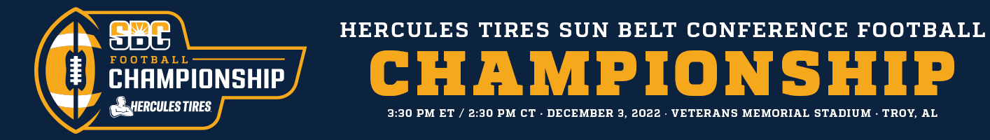 The 2022 Hercules Tires Sun Belt Football Championship will be played on Saturday, Dec. 3, and will be nationally televised on ESPN at 3:30 p.m. ET/2:30 p.m. CT. The game will feature East Division champion Coastal Carolina at West Division champion Troy at Veterans Memorial Stadium in Troy, Ala.