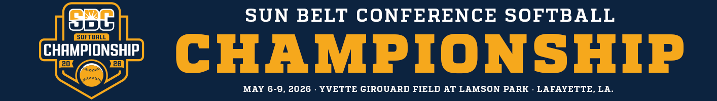 Championship Schedule First Round: Wednesday, May 6 Game 1: 4:00 PM CT No. 7 Seed vs. No. 10 Seed Live Stats | Recap | Box Score | ESPN+ Game 2: 7:00 PM CT No. 8 Seed vs. No. 9 Seed Live Stats | Recap | Box Score | ESPN+ Quarterfinals: Thursday, May 7 Game 3: 10:00 AM CT No. 3 Seed vs. No. 6 Seed Live Stats | Recap | Box Score | ESPN+ Game 4: 1:00 PM CT No. 2 Seed vs. Game 1 Winner Live Stats | Recap | Box Score | ESPN+ Game 5: 4:00 PM CT No. 1 Seed vs. Game 2 Winner Live Stats | Recap | Box Score | ESPN+ Game 6: 7:00 PM CT No. 4 Seed vs. No. 5 Seed Live Stats | Recap | Box Score | ESPN+ Semifinals: Friday, May 8 Game 7: 3:00 PM CT Game 3 Winner vs. Game 4 Winner Live Stats | Recap | Box Score | ESPN+ Game 8: 6:00 PM CT Game 5 Winner vs. Game 6 Winner Live Stats | Recap | Box Score | ESPN+ Championship: Saturday, May 9 Game 9: 1:30 PM CT Game 7 Winner vs. Game 8 Winner Live Stats | Recap | Box Score | ESPN2 Softball Home NCAA Softball Home Yvette Girouard Field at Lamson Park Championship Tickets Championship Store 2026 Championship Bracket Schedule Standings Statistics Record Book Follow the #SunBeltSB